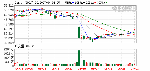 受到財報不達預期影響,昨晚,加拿大鵝(GOOS.N)股價大幅跳空低開,開盤報41.41美元,大大低於前天的49.02美元收盤價。
