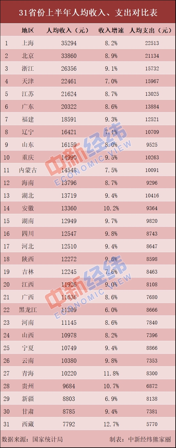 根據國家統計局的數據,上海市上半年居民人均可支配收入居首,為35294元,同比增長8.2%,北京則以33860元緊跟其後,增速則比上海略高,為8.9%。