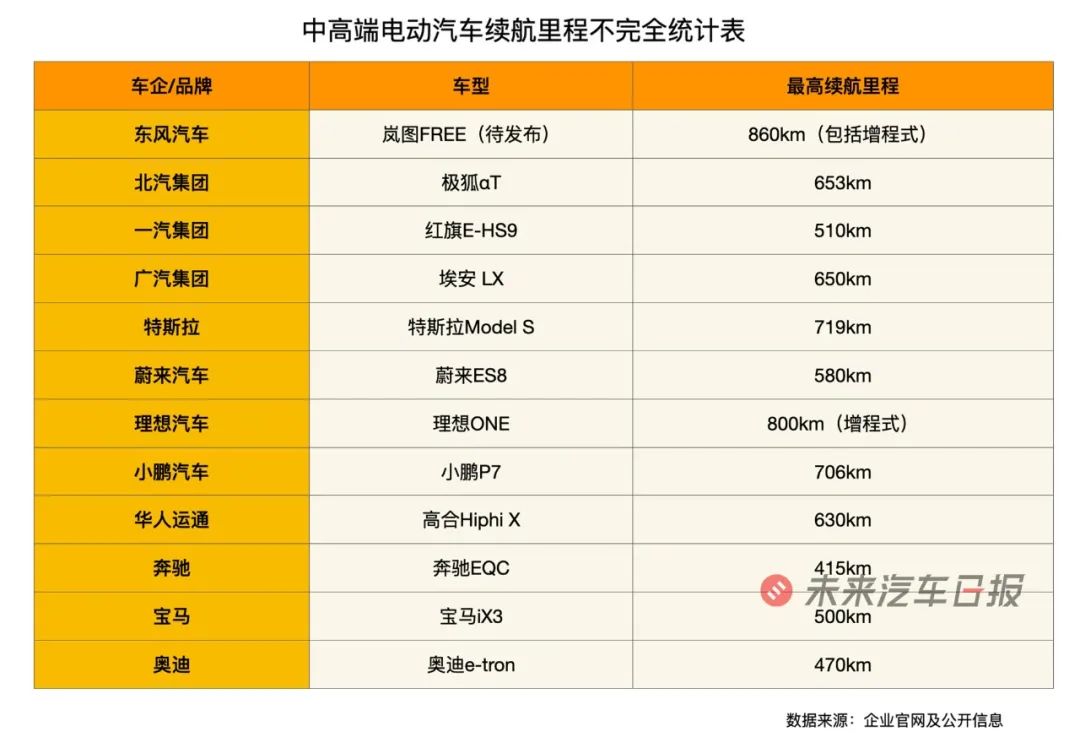 據未來汽車日報(ID:auto-time)不完全統計,目前在中高端電動汽車市場,主流在售產品的續航里程集中在500-800km之間,但隨着更多玩家湧入,續航里程的天花板不斷被打破。例如,東風旗下嵐圖品牌即將發布的首款量產車嵐圖FREE,提供純電和增程兩種動力選擇,NEDC綜合續航超860km。