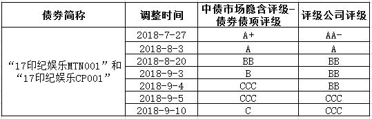 發行人存續債券共2隻,中債金融估值中心今日將相關債券的中債市場隱含評級-債券債項評級由CCC調整至C。中債金融估值中心對印紀娛樂傳媒股份有限公司發布的經審計的2017年年度財務報告、2018年中期財務報告及中債企業債收益率曲線(CC)估算的清算價格進行比較,根據審慎的估值原則,採用債企業債收益率曲線(CC)估算的清算價格,並對相應債券估值予以調整。
