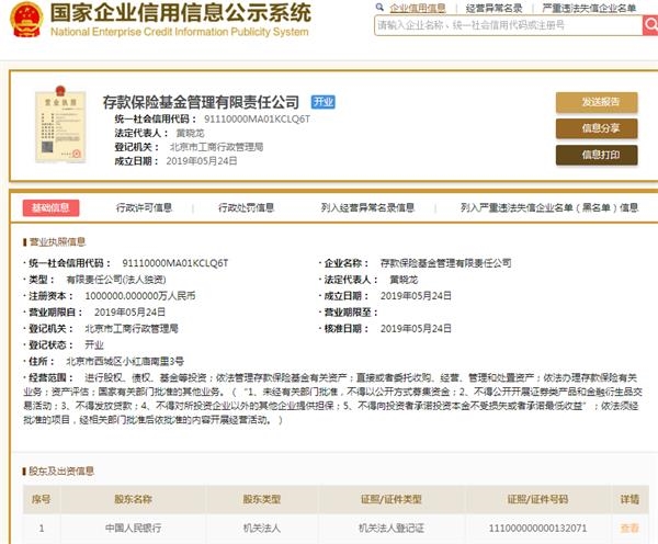 工商註冊信息显示,5月24日,中國人民銀行設立存款保險基金管理有限責任公司(下稱“存款保險基金公司”)。