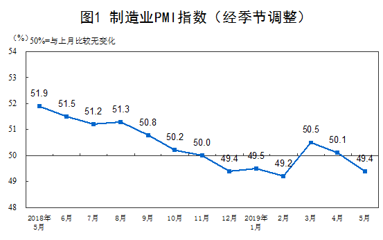 2019年5月份,中國製造業採購經理指數(PMI)為49.4%,比上月回落0.7個百分點。