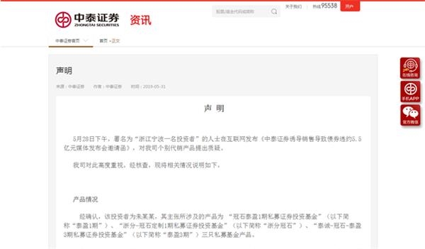5月28日下午,署名為“浙江寧波一名投資者”的人士在互聯網發布《中泰證券誘導銷售導致債券違約5.5億元媒體發布會邀請函》,對我司個別代銷產品提出質疑。