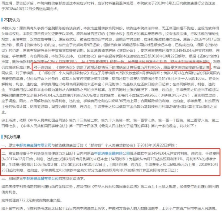 最終,法院判決:原告中郵消費金融有限與被告魏俊康簽訂的《“郵你貸”個人消費貸款協議》於2018年10月22日解除。同時,2018年10月23日起的利息、違約金、手續費用之和以借款本金尚欠部分為基數按照月利率2%的標準計算至實際清償之日止。