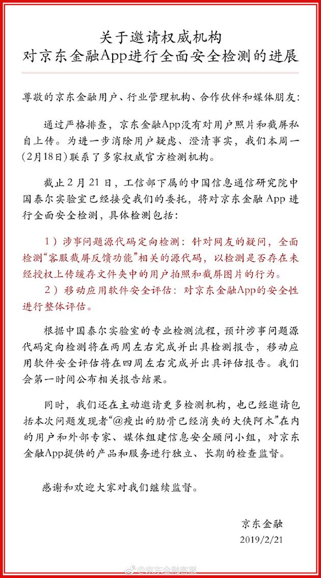 關於邀請權威機構對京東金融App進行全面安全檢測的進展