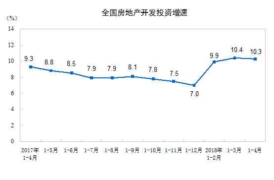 2018年1-4月份,全國房地產開發投資30592億元,同比名義增長10.3%,增速比1-3月份回落0.1個百分點。其中,住宅投資21331億元,增長14.2%,增速提高0.9個百分點。住宅投資占房地產開發投資的比重為69.7%。