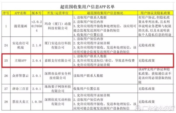 據了解,8月14日,廣東警方對7月份監測發現的44款存在突出安全問題的App進行了曝光,嘉聯支付旗下立刷App也在曝光名單之中。據曝光情況显示,立刷APP存在讀取用戶通訊錄;允許發送短信、彩信;允許錄製音頻等超範圍收集用戶信息的情況,且沒有隱私政策。