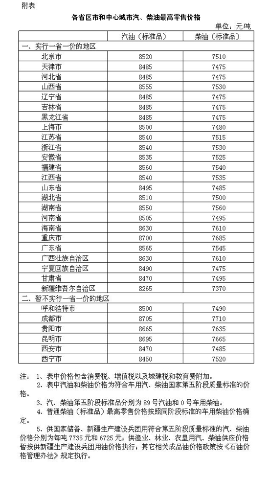 調整后,各省(區、市)和中心城市汽、柴油最高零售價格見附表。相關價格聯動及補貼政策按現行規定執行。