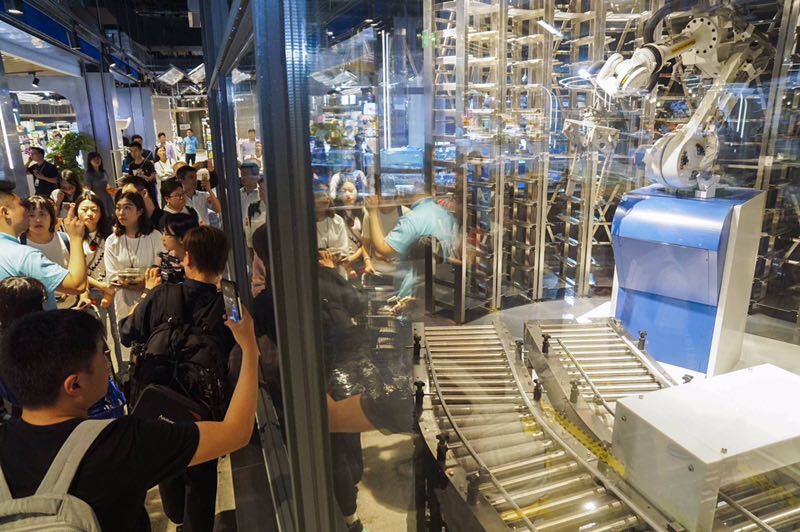天貓新零售商家遊學團正在走訪被稱為“科幻大片”現實版的盒馬機器人餐廳