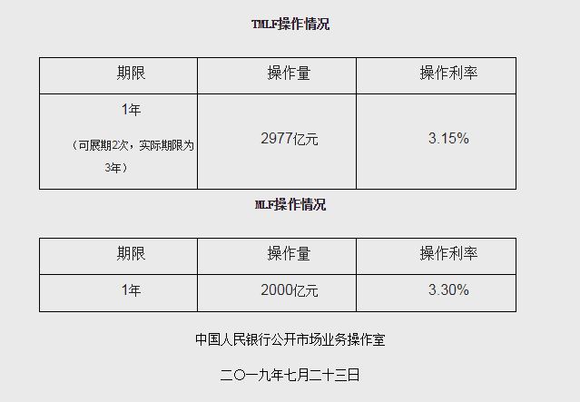 2019年7月23日,人民銀行開展定向中期借貸便利(TMLF)操作2977億元,並開展中期借貸便利(MLF)操作2000億元,兩項操作合計4977億元,與當日中期借貸便利(MLF)到期量5020億元基本相當。開展上述操作后,銀行體系流動性合理充裕,今日不開展逆回購操作。具體情況如下: