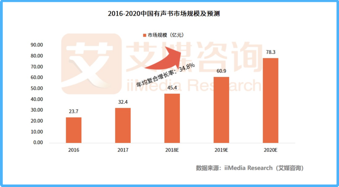 根據艾媒諮詢的報告,到2017年時,中國有聲書市場規模達32.4億元,報告認為這個市場未來3年年複合增長率將達到34.8%。