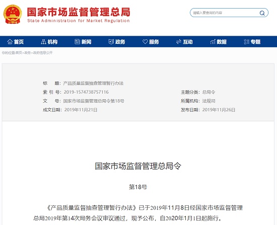 《產品質量監督抽查管理暫行辦法》已於2019年11月8日經國家市場監督管理總局2019年第14次局務會議審議通過,現予公布,自2020年1月1日起施行。