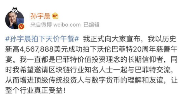 北京時間6月4日0點02分,孫宇晨微博正式官宣:以歷史新高的4567888美元成功拍下巴菲特20周年慈善午宴。兩分鐘之後,孫宇晨再發【致社區的一封信】,直接圈出了區塊鏈的重點。
