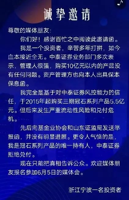 據悉,這位來自“浙江寧波的投資者”發了一個媒體邀請函,大致的內容是,他在中泰證券買了5.5億的私募產品,結果成了唯一的持有人,然而最後卻血本無歸,要開媒體發布會“手撕”中泰。