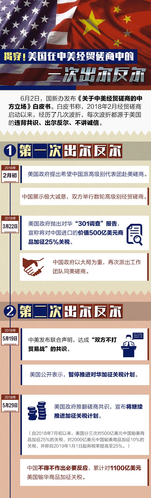 摘要 【揭穿!美國在中美經貿磋商中的3次出爾反爾】國務院新聞辦公室2日發表《關於中美經貿磋商的中方立場》白皮書,揭穿美國在中美經貿磋商中的3次出爾反爾。(人民日報)