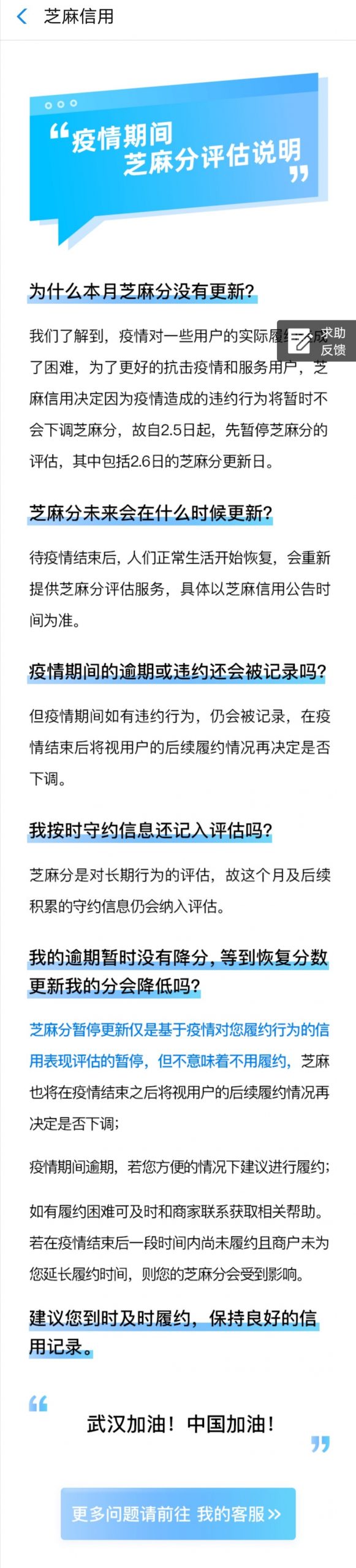 此外,芝麻信用分暫停評估與花唄並無關係,用戶仍需要按時還花唄,公告涉及的情況例如線下租借充電寶,因疫情導致無法出門致使無法歸還等問題。