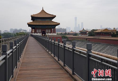 9月27日,北京故宮北城牆木棧道已鋪設完畢,即將正式開放。 中新社記者 杜洋 圖