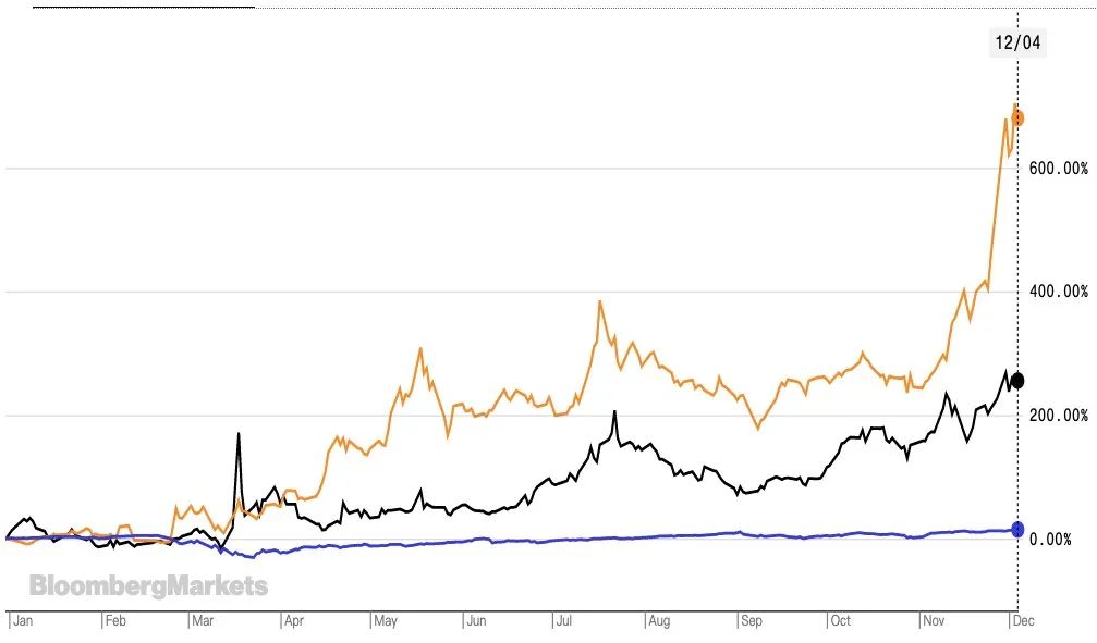 圖:截至12月2日,莫德納股價年內漲幅達到679.75%,拜恩泰科年內漲幅為255.38%,均遠超過標普500指數年內14.5%的漲幅。黃線為莫德納,黑線為拜恩泰科,藍線為標普500指數