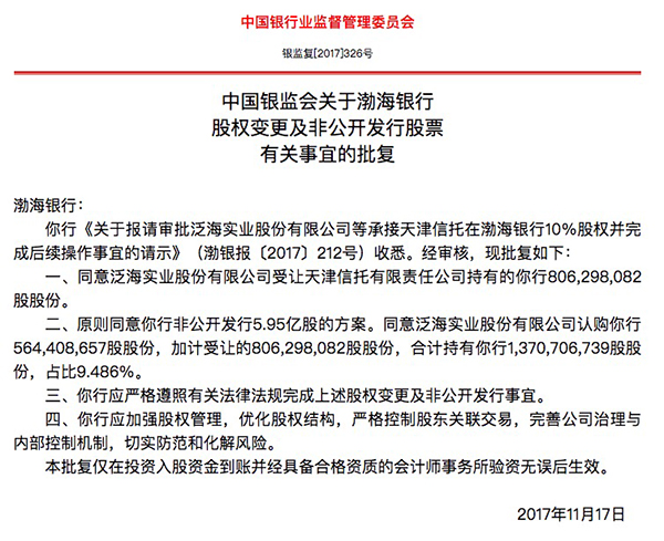 中國銀監會關於渤海銀行股權變更及帆開發行股票有關事宜的批複。