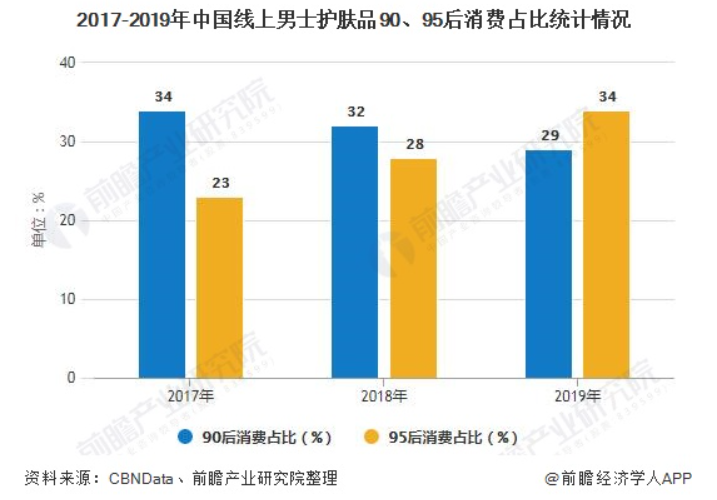 據前瞻研究院數據显示,近80%的90/95后男士成為線上男性護膚品的主要消費者。在近一年內,95后已經逐漸超越90后,成為線上男士護膚市場的第一大消費主力。