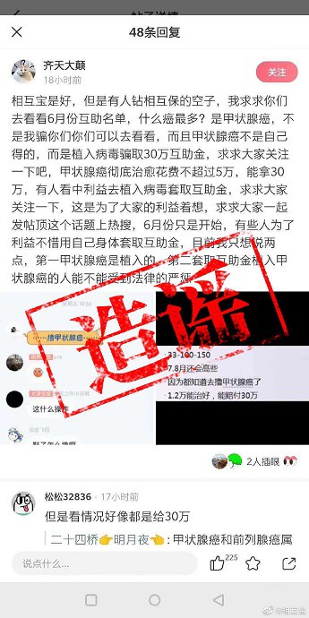 6月28日消息,針對近日在微信群里流傳的有關“植入甲狀腺癌病毒騙取30萬互助金”說法,相互寶官微今日回應稱:這是造謠!