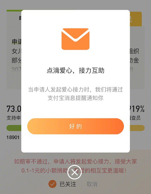 6月13日消息,今日,支付寶旗下的相互寶上線第二例賠審案,同時宣布開通“愛心接力”功能,讓賠審失敗的申請人可以多一種獲得幫助的途徑。