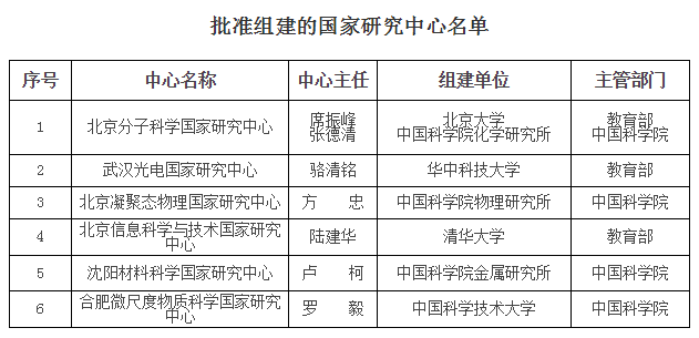 據科技部網站消息,依據《國家科技創新基地優化整合方案》的任務要求,科技部會同有關部門啟動國家研究中心組建工作,決定批准組建北京分子科學等6個國家研究中心,並會同各國家研究中心所在地在政策、資金及條件建設等方面給予支持。