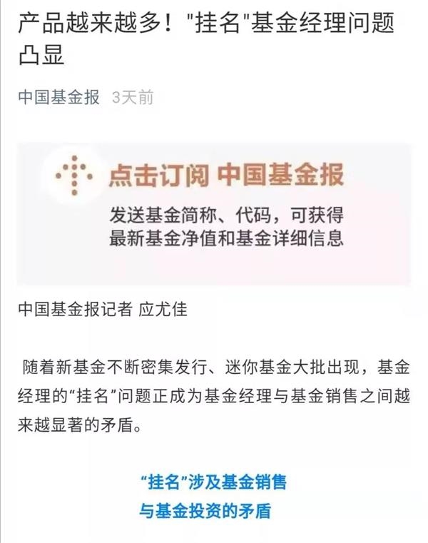 上周日晚間,基金君曾報道《產品越來越多!“挂名”基金經理問題凸顯》,其中談到,隨着產品數量越來越多,迷你基金大批出現,基金經理的“挂名”問題正成為基金經理與基金銷售之間越來越顯著的矛盾。雖然基金經理“挂名”是明確的違規行為,但在基金業內這一現象卻一直存在。本周一該報道在《中國基金報》也進行了刊發。周二,監管部門就出台了相關監管政策。
