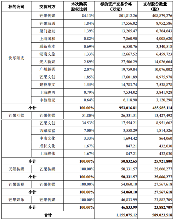 本次交易的標的資產為湖南快樂陽光互動娛樂傳媒有限公司(以下簡稱“快樂陽光”)、上海芒果互娛科技有限公司(以下簡稱“芒果互娛”)、上海天娛傳媒有限公司(以下簡稱“天娛傳媒”)、芒果影視文化有限公司(以下簡稱“芒果影視”)及湖南芒果娛樂有限公司(以下簡稱“芒果娛樂”)各100%股權。
