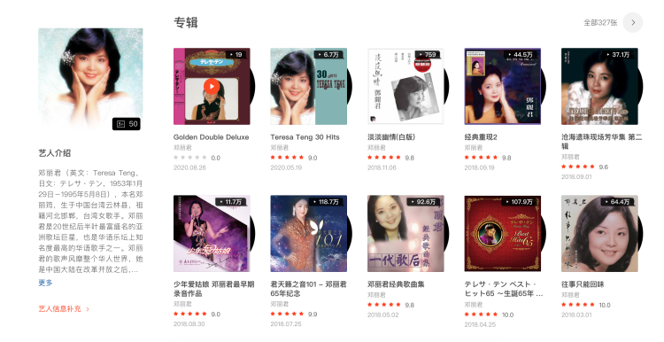 鄧麗君的曲庫就是我2013年整理的。那是個大工程,很多資料當時其實蠻難找的。整理了將近一個月,聯繫了好幾個君迷才一起完成。現在蝦米的鄧麗君條目(327張專輯)大部分是我們那時候梳理出來的。