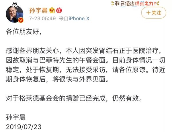 昨日(7月23日)凌晨,拍下巴菲特午餐的波場TRON創始人孫宇晨突然在其微博上宣布,“本人因突發腎結石正於醫院治療,因故取消與巴菲特先生的午餐會面。”