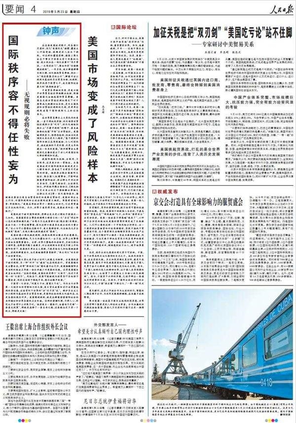 從5月23日到31日,人民日報連續刊發署名鐘聲的評論。評論認為,從無視規則、零和博弈、逆勢而動、拒絕競爭、唯我獨尊到雙重標準、言而無信、一意孤行、自作聰明,倘若美方由着性子定要“一條道走到黑”,那就是選擇了一條自棄之路,這條路註定只有一個終點,那就是失敗!