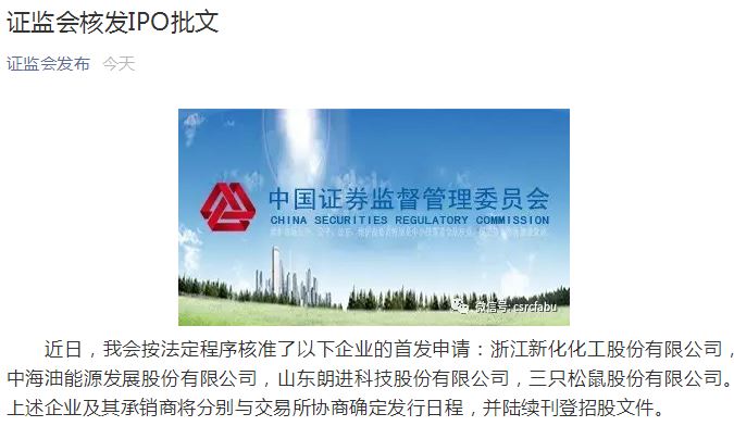 摘要 【證監會核發4家企業IPO批文】近日,我會按法定程序核准了以下企業的首發申請:浙江新化化工股份有限公司,中海油能源發展股份有限公司,山東朗進科技股份有限公司,三隻松鼠股份有限公司。上述企業及其承銷商將分別與交易所協商確定發行日程,並陸續刊登招股文件。(證監會)