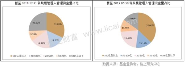 格上財富數據显示,截止2019年6月末,全市場證券類私募共管理資金2.33萬億,其中百億機構共管理8621億,占行業總規模的比例從2018年底的31.81%增長到37%,增長5.19個百分點。