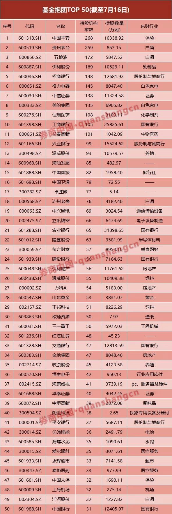 根據已經披露基金二季報的數據,貴州茅台、中國平安、五糧液、格力電器、伊利股份、溫氏股份、中信證券、保利地產、美的集團、長春高新晉陞為最受二季度首批公募基金偏愛的前十大重倉股。
