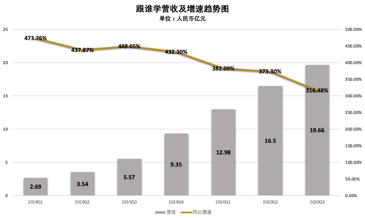 從2018年起,跟誰學連續8個季度實現規模化盈利,凈收入連續6個季度同比超過4.5倍,連續5個季度的增速超過了400%。