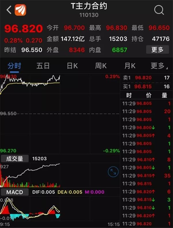 在此背景下,國債期貨逆轉此前跌勢,連續兩日上漲。T主力合約今日開盤價為96.7元,開盤后隨即直線上漲,短時間內迅速將漲幅擴大至0.29%,截至上午收盤,T主力合約上漲0.28%,達96.82元。