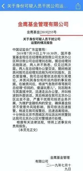 報告稱,國開泰富基金總經理楊波到金鷹基金北京辦公區拜訪金鷹總經理劉志剛時,公開用粗俗語言辱罵劉志剛。金鷹基金隨後報警,並向監管層彙報。