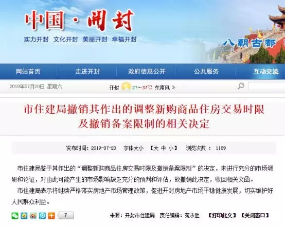 7月20日,開封政府網掛出一則通知公告,即市住建局撤銷其所作出的調整新購商品住房交易時限及撤銷備案限制的相關決定。