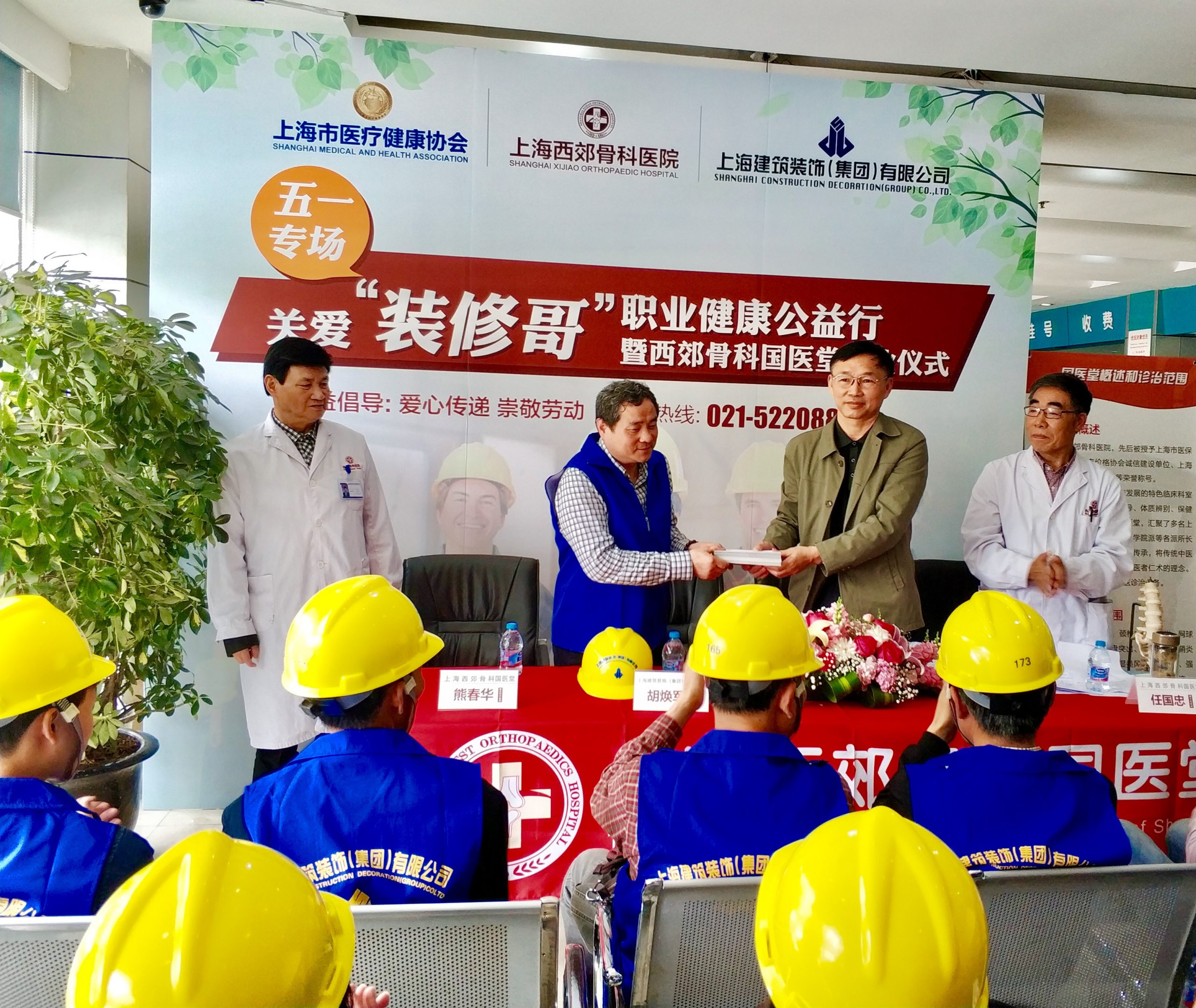 在2018五一國際勞動節來臨之際,正值上海西郊骨科醫院“國醫堂”開業,為了向在上海城市建設中做出顯著貢獻的勞動者表示愛心和敬意,上海市醫療健康協會攜手西郊骨科“國醫堂”,在4月26日舉辦了“關愛健康、崇敬勞動”的公益活動,為有着60年歷史,承接裝飾南京西路、淮海路大部分著名近代建築,為上海城市的更新與繁榮發展做出了顯著貢獻的上海建築裝飾集團公司的百餘名優秀裝修工人,進行了職業健康講座及諮詢。醫院還向裝修工人兄弟們贈送了保溫杯等禮物。
