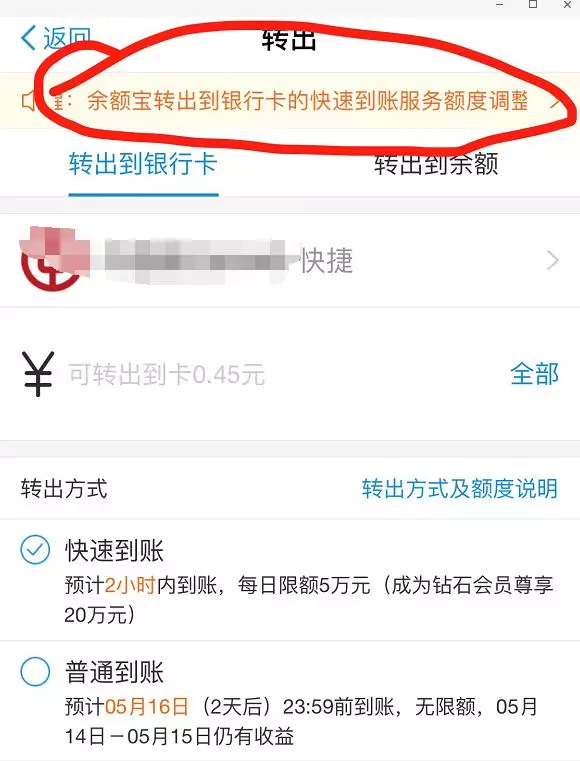 公告显示,從下個月也就是6月6日0點開始,餘額寶轉出到銀行卡當日快速到賬(也就是T+0)額度有所調整,從每日限額5萬元調整到1萬元,轉出到銀行卡普通到賬服務(第二天到賬額度)及消費支付等均不受影響。