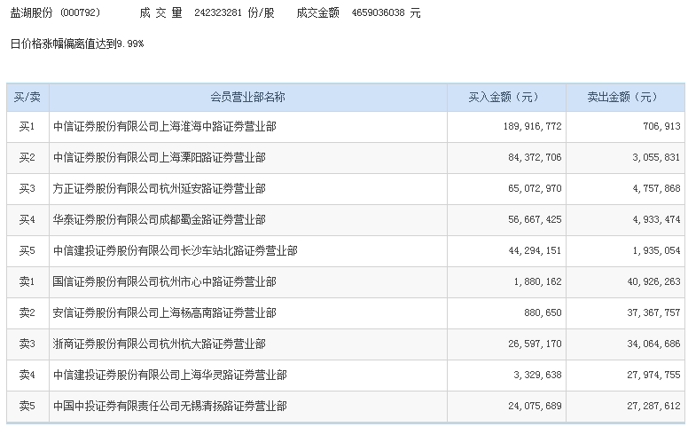 交易所盤后數據,今日買賣鹽湖股份以遊資為主,買賣前五券商營業部席位合計買入公司股份49708.73萬元,合計賣出18301.02萬元,凈買入31407.71萬元。其中,中信證券上海淮海中路證券營業部買入1.90億元,買入金額最多,占成交總額的4.08%;中信證券上海溧陽路證券營業部買入8437.27萬元,佔比1.81%,剩餘券商營業部買賣金額相對較少。