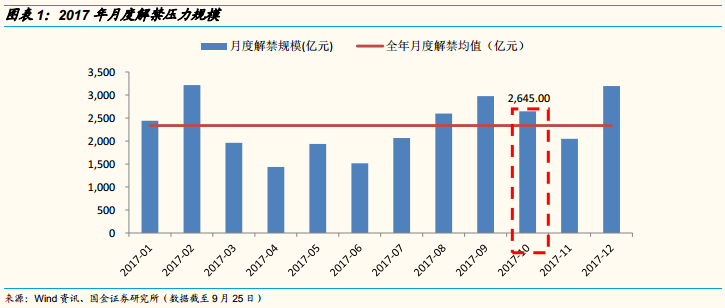 據國金證券統計,10月份解禁規模總量為2645億元,單月較9月環比下降11%。以9月25日的收盤價來測算,2017年全年解禁規模約為2.80萬億元,四季度為7890億元,較三季度(7637億元)有所上升;其中10月解禁規模為2645億元,佔全年解禁規模的9.44%,是單月解禁規模第4大的月份。另外,10月解禁規模較9月份(2974.70億)下降329.70億,環比下降11.1%。