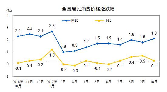 10月份,全國居民消費價格環比上漲0.1%。其中,城市上漲0.1%,農村上漲0.2%;食品價格持平,非食品價格上漲0.1%;消費品價格上漲0.2%,服務價格下降0.1%。