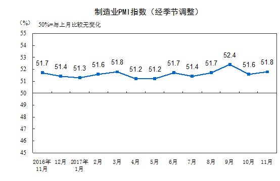 據國家統計局官網消息,2017年11月份,中國製造業採購經理指數(PMI)為51.8%,比上月上升0.2個百分點,製造業繼續保持穩中有升的發展態勢。
