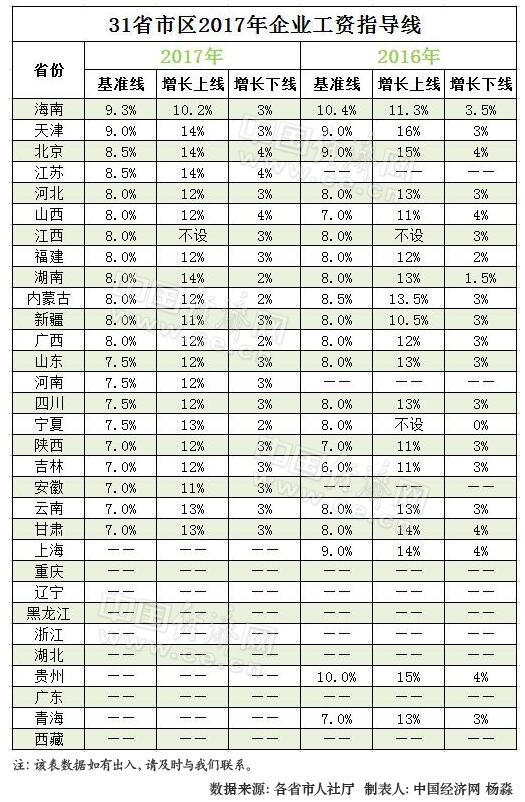 據經濟日報-中國經濟網記者不完全統計,截止到11月14日,全國31個省市區中已經有海南、天津、北京、江蘇、河北、陝西、江西、福建、湖南、內蒙古、新疆等在內的21個省區公布了2017年的工資指導線。記者發現,與去年相比,多個省份的指導線數值都有所下調。