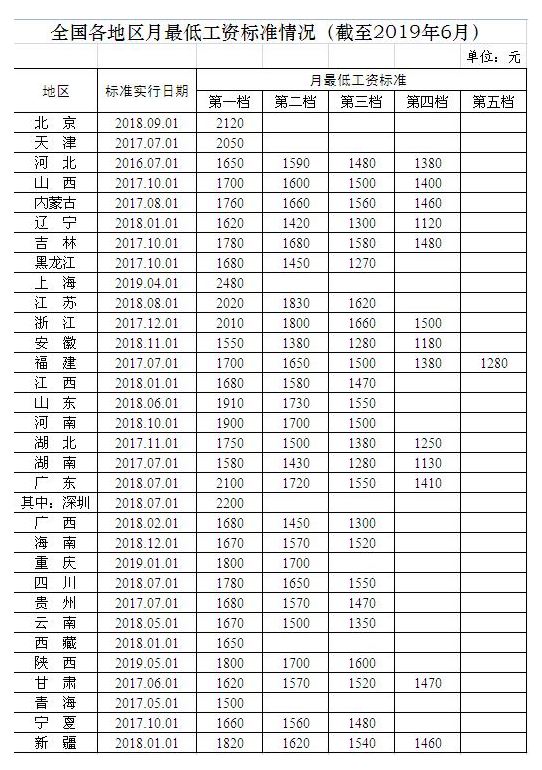 最新31省份最低工資標準出爐。人社部網站今日(24日)公布全國各地區月工資、小時最低工資標準情況(截至2019年6月)。上海、北京、廣東、天津、江蘇、浙江這6省份最低工資標準超過2000元,其中上海月最低工資2480元為全國最高。此外,北京小時最低工資標準為24元,居全國之首。