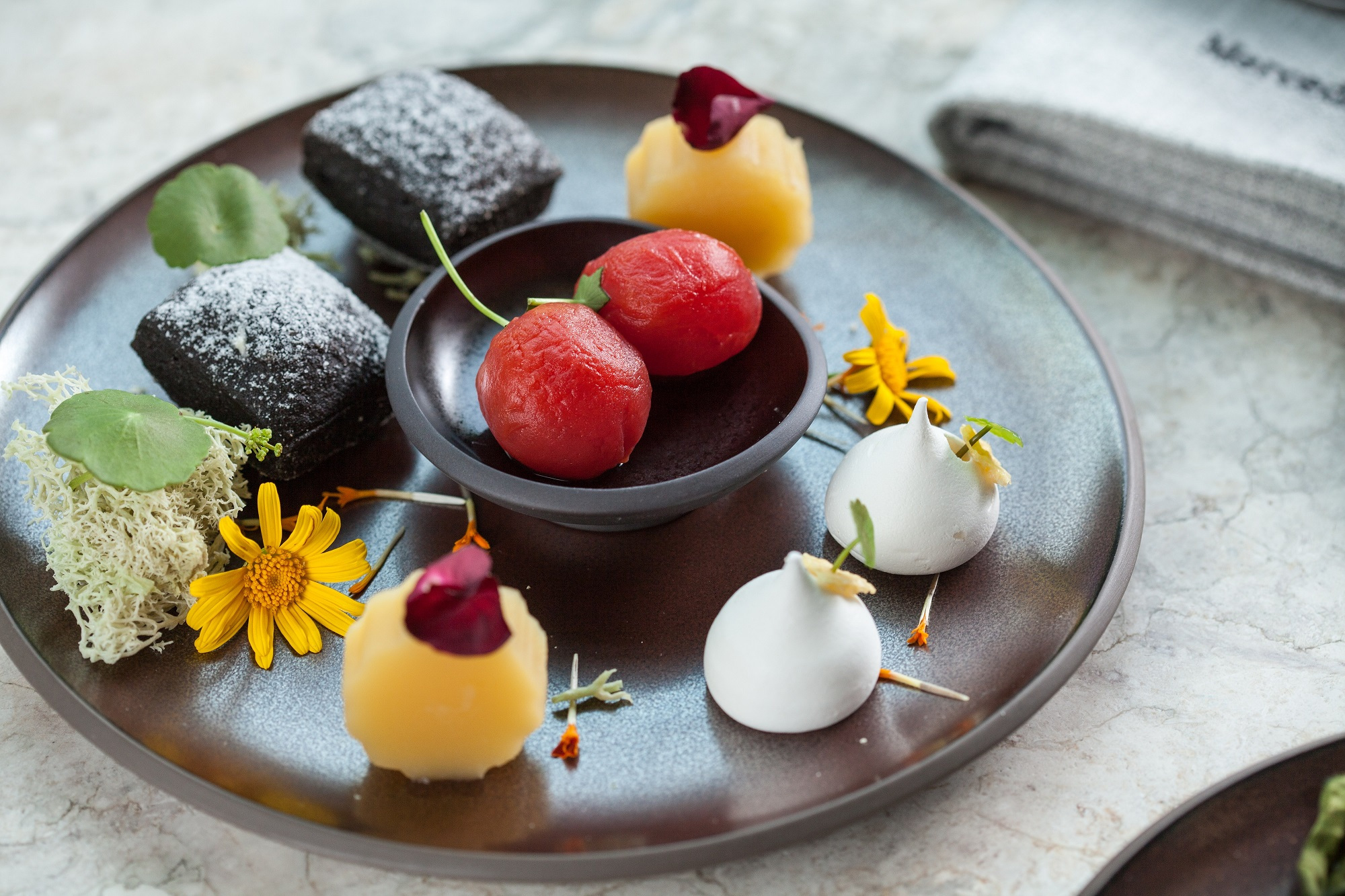 秉承 Vincent 個人的“三角”烹飪哲學:自然風味(Nature)、食材易得且不失趣味(Common yetPlayful)、創新時尚(Fashion),時尚下午茶品選材於自然健康且極具奇思。“甘藍脆片”實為羽衣甘藍,低熱量、高纖維並富含多種維生素,口味略帶苦澀,搭配 me 自製泡菜鹽,神奇的“第六種味道”Umami 躍然舌尖,鮮美搭配創意呈現。加入墨魚汁炸出的“法式黑金奶油泡芙”帶着高級的黑金質感及淡淡的檸檬草香,奶油芝士內陷口感細膩滑爽,這顆法式“小黑鑽”類似“穿着泡芙外衣的甜甜圈”,創意搭配新奇有趣。日式味增味的“奶油蛋白酥”形似可愛的“小籠包”,讓你在品味時獲“拆禮物”一般的驚喜。除了各類創意甜品,下午茶還提供三款傳統中式糕點,喚起您兒時的記憶。