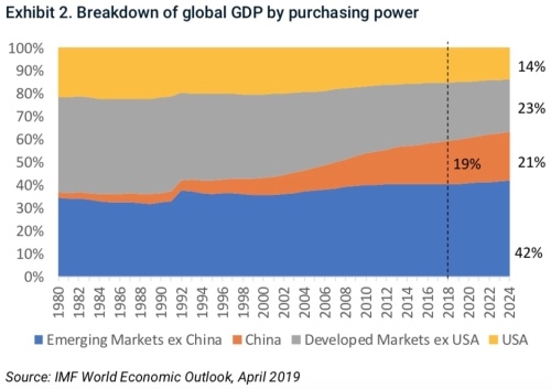 魏震稱,回報導向型的投資者通常會關注股票所在市場的經濟規模變化。根據IMF的最新預測,到2024年,中國將佔全球GDP的19%,很快就會接近美國對全球GDP 22%的貢獻;按購買力平價,中國的經濟規模早在2014年就已經超越美國,並且預計在2024年將達到美國的1.5倍。